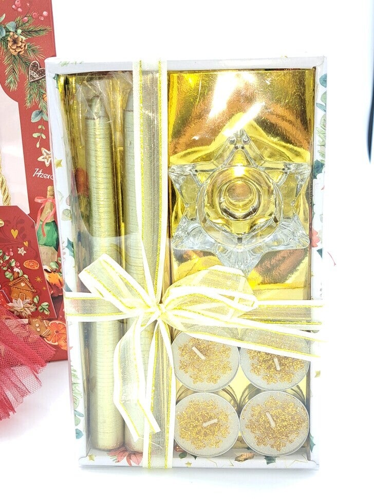 Kerstcadeaudoos , compleet sfeervolle theelichtjes (4stuks)+2 kaarsen en stijlvolle glazen kandelaar. Kaarshouder: 8cmx7x3,5H . Kandelaar voor dubbel gebruik -Duur: 2uur theelichtje, stamkaarsen 8 uur.