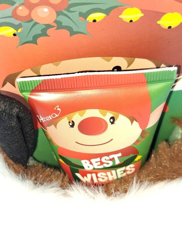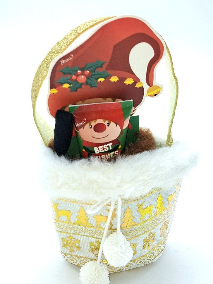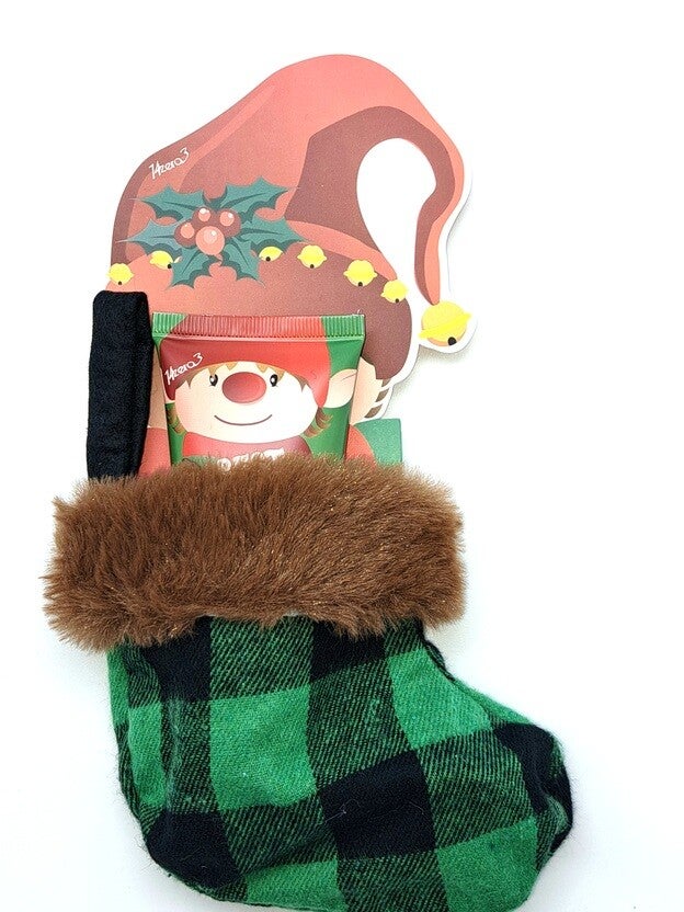 Feestelijke cadeausok "Elvis" om op te hangen, inclusief voetcrème (60ml) met de geur "Suikerpruim". Met zacht eco-bont en verpakt in een stijlvolle verpakking van 12x3,5x22cm. Ideaal om cadeau te geven tijdens de feestdagen!! Deze kerstgeschenkset ,verpakt in een feestelijke stoffen kersttas (13x15 cm, handvat 24 cm) met eco-bont, gouden pailletten en pompons.