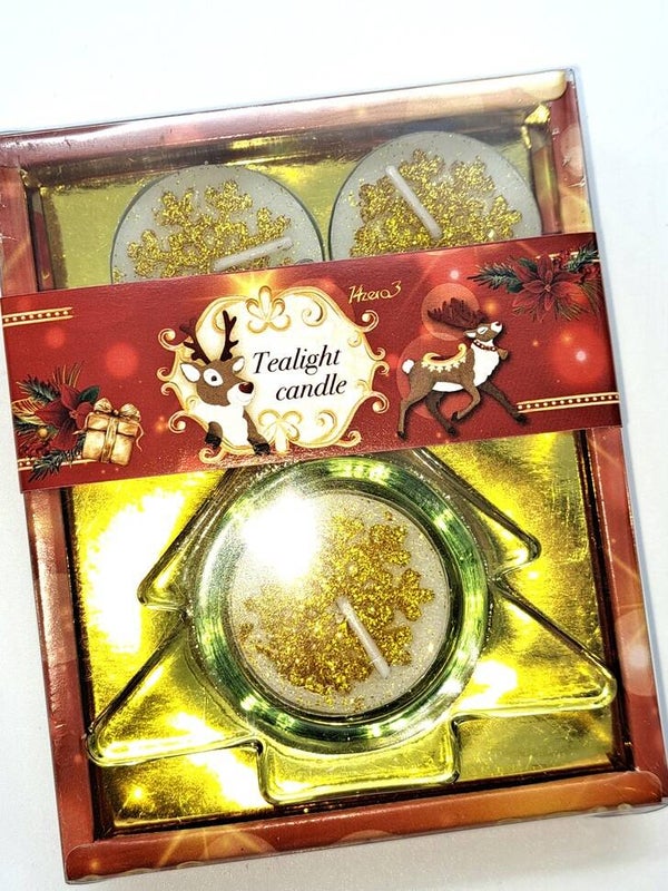 -een kerstboomvormige glazen theelichthouder en drie bijpassende theelichtjes. Verpakt in een doosje (10x12,5x2cm) en ideaal om een warme, sfeervolle touch toe te voegen aan elk interieur tijdens de feestdagen.