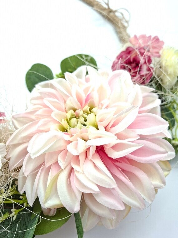 De krans van 30cm is zorgvuldig samengesteld op een natuurlijke jute ring met een diameter van 30 centimeter, ideaal voor iedere deur of muur. De blikvanger is de grote, zachtroze Dahlia van zijde, omringd door kleinere bordeauxroze en crème rozen. De krans krijgt een frisse, moderne touch door de weelderige toevoeging van groene eucalyptus en delicate witte bloesems. Een fijn, decoratief gaasje voegt een romantisch-landelijke uitstraling toe.