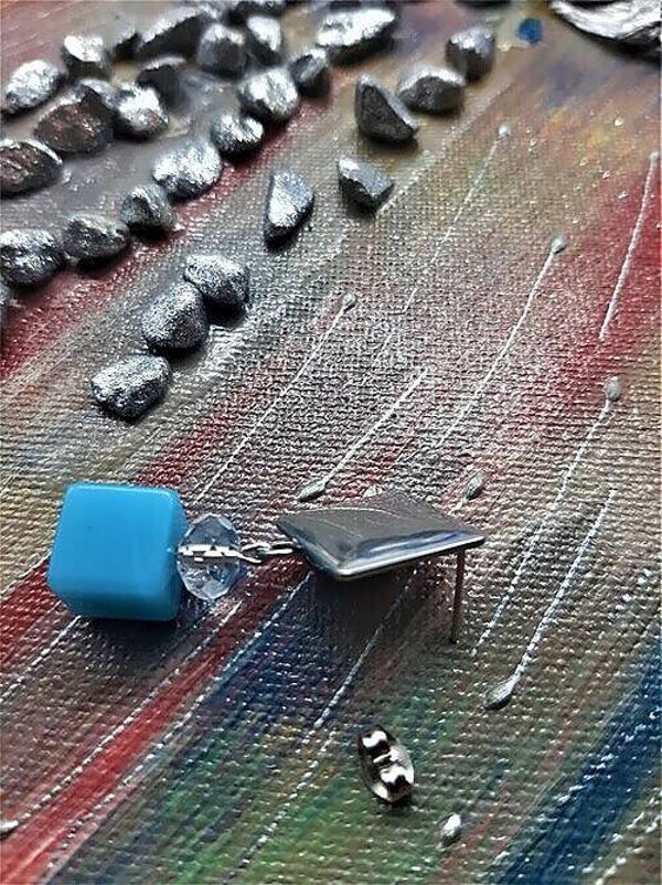 Maak je outfit compleet met deze handgemaakte oorbellen! Oorbellen/oorstekers zijn van roestvrij staal gemaakt en vierkant met oogjes. Maat: ca. 20mm (Ø 3mm). Kleur: zilver. Aan de oorstekers hangen blauwkleurige vierkante (1cm) en ronde(5mm) kunststof kraaltjes. Lengte van de oorbellen is 4cm.
