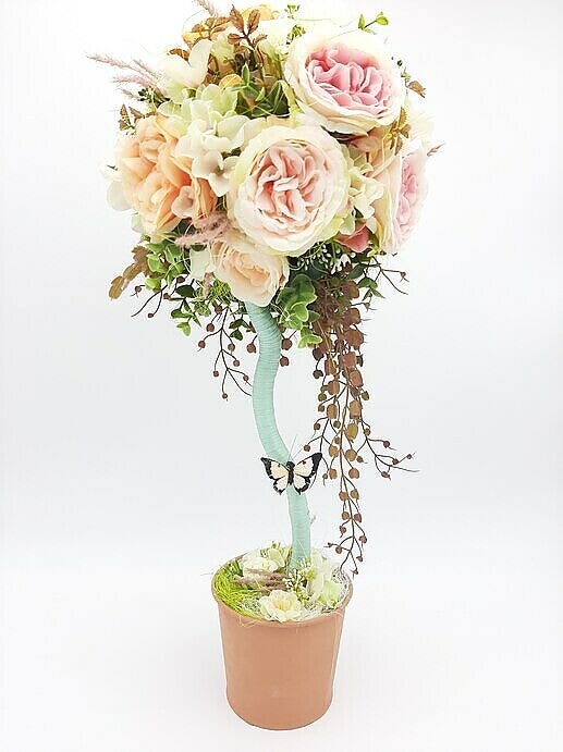 Versier jouw interieur met deze prachtige , unieke bloemen decoratie. Handgemaakt met kunstbloemen. Ideaal is dat deze decoratie door de kunstbloemen geen onderhoud nodig. De afmetingen van het bloemstuk H 53,5cmxD23,5cm. Vaas(verzinkt): 10cm hoogx12cm breed.