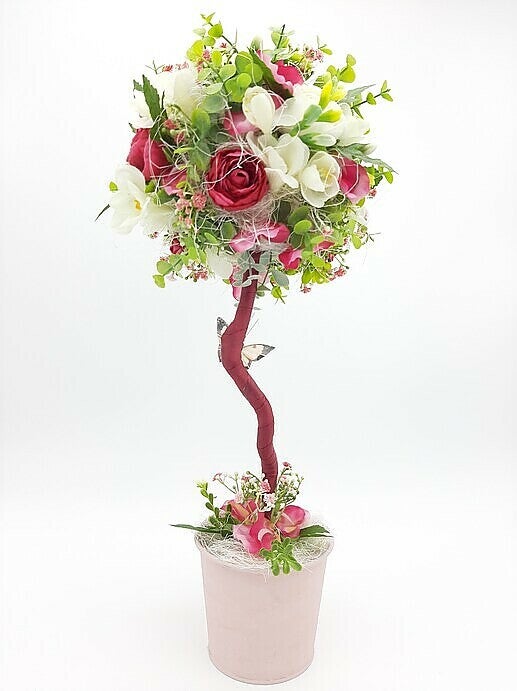 Topiary ( "boom van geluk") is een kleine decoratieve boom die wordt gebruikt voor het decoreren van interieurs. Handgemaakt met zijden bloemen. Dit unieke bloesemboompje is een leuke decoratie voor in uw woning. H48,5cmxD18,5cm. Vaas(verzinkt): 10cm hoogx12cm breed.