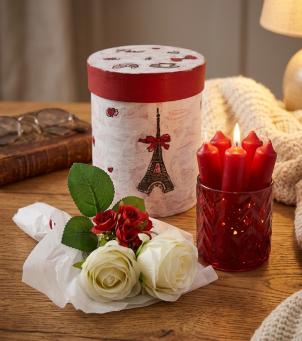 Op zoek naar een cadeau? Supermooie giftbox! Handgemaakte doos d13xh17cm, waxinehouder rood d7,5xh8 met 5 Rustik Lys kaarsen 11cmx1,5cm,kunstboeketje.